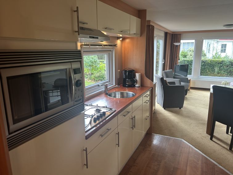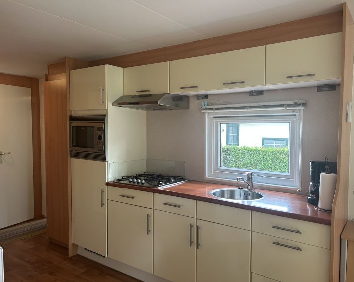 - Keuken voorzien van combi-oven, gasfornuis, afzuigkap en een koelkast met vriesvak