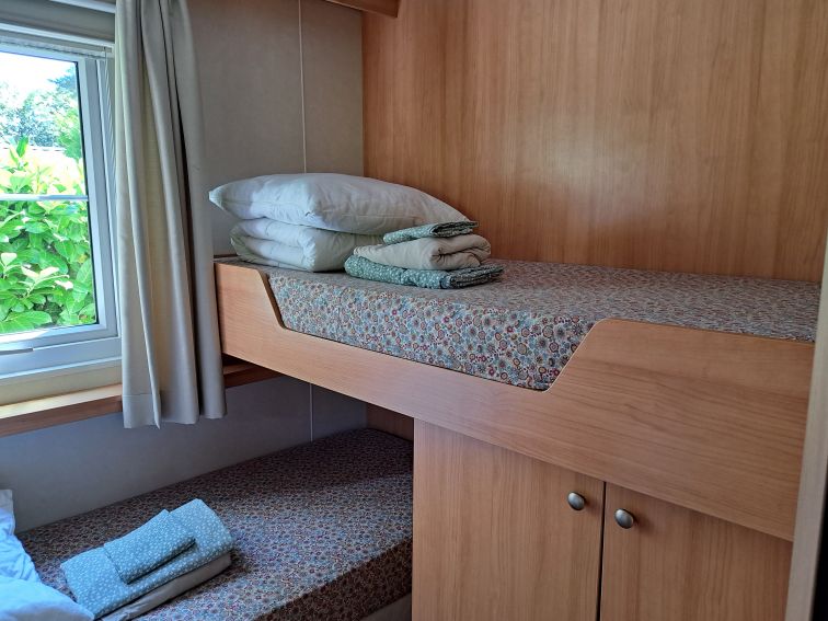 - één slaapkamer met een stapelbed, hier zijn ook vaste kasten aanwezig